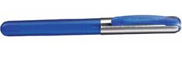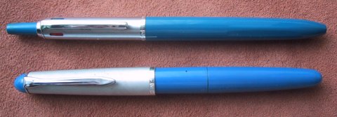 Pelikano (1965) | blau, Edelstahlfeder (halb verdeckt) | Messing verchr. mit Schnabelclip, spitz zulaufend, Steckkappe |
